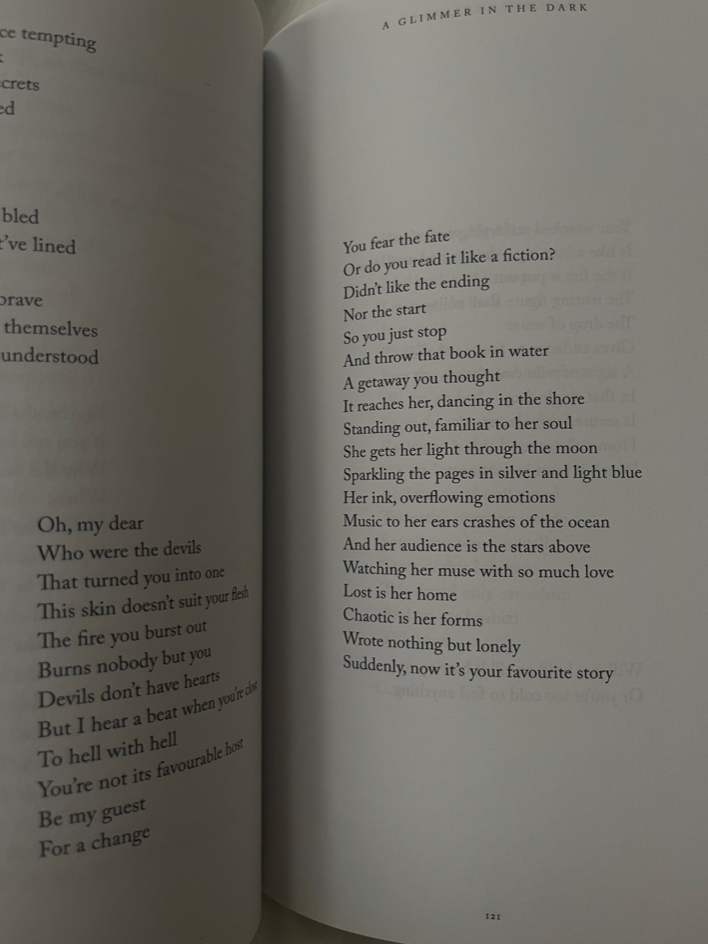A poetry collection documenting the heartbreaking and transformative journey of Afghan refugee Samman Akbarzada. Akbarzada interweaves a powerful tapestry of prose reflecting on her connection to, as well as the inevitable escape and separation from, her war-torn homeland of Afghanistan and the suffering and resilience of those living on the margins of yet another immense human tragedy. A Glimmer In The Dark is ultimately about the perseverance and strength survivors find through deep familial bonds and the compassionate assistance of communities devoted to helping those displaced by war and suffering.